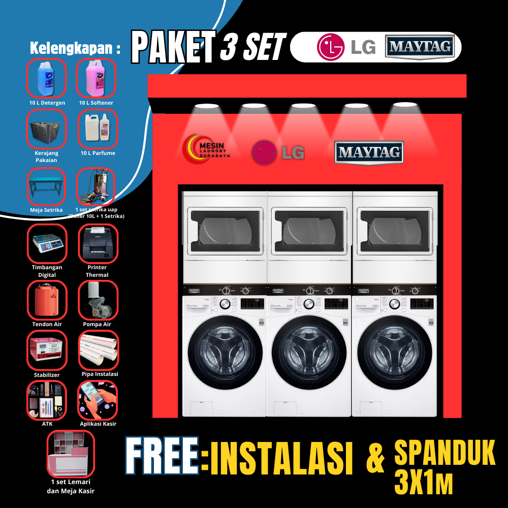 Dengan paket ini, Anda tidak hanya mendapat mesin cuci & pengering, tapi juga seluruh perlengkapan yang menunjang usaha laundry profesional.